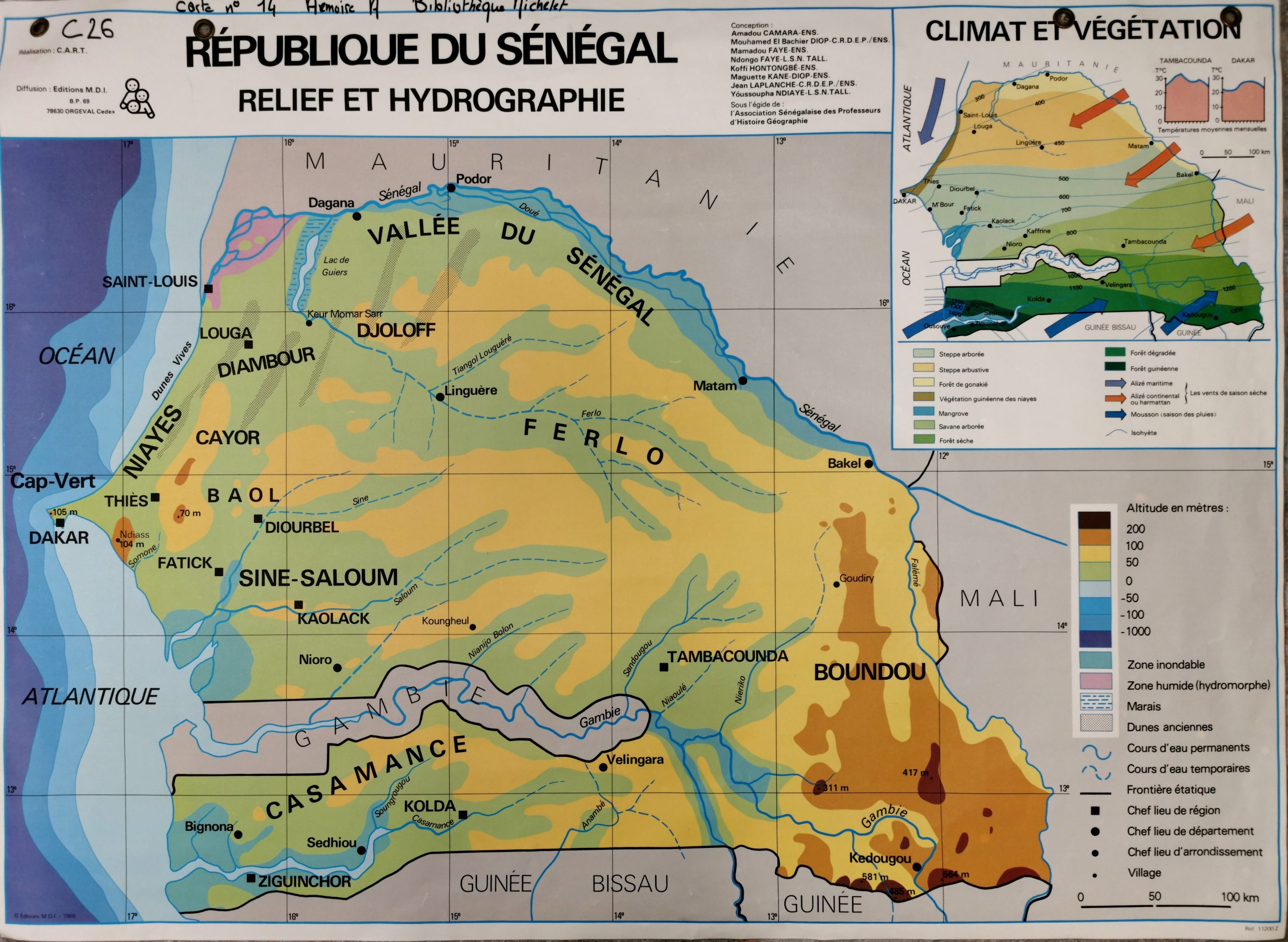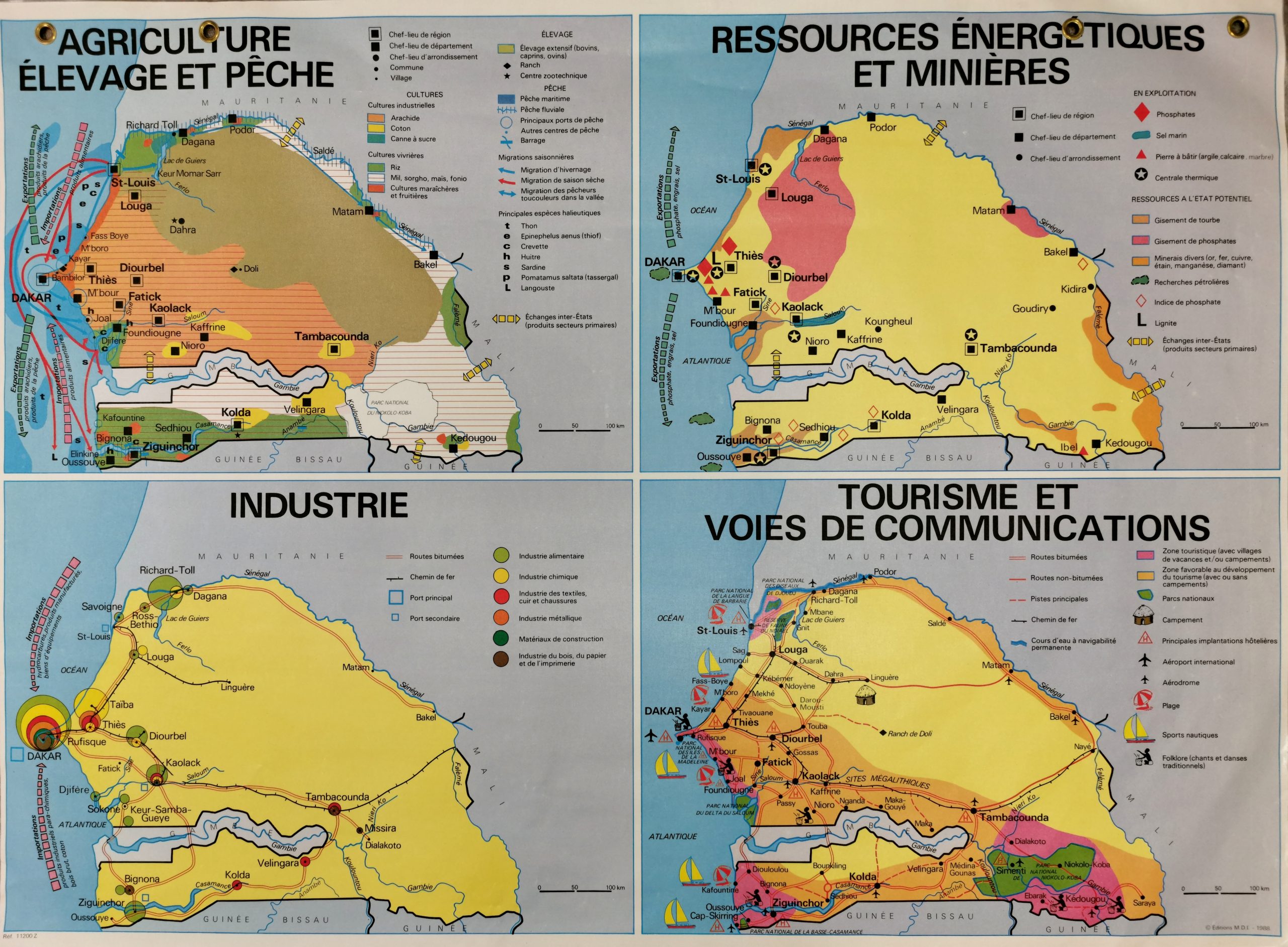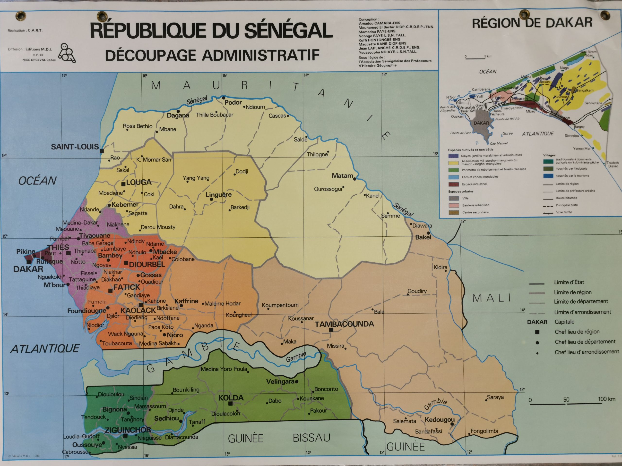 Etat de conversation: Carton fin  plastifié. 4 oeillets à 5 et à 20 cm du bord. Encart: 1 en haut à droite : Région de Dakar : espaces urbains, cultivés, villages.