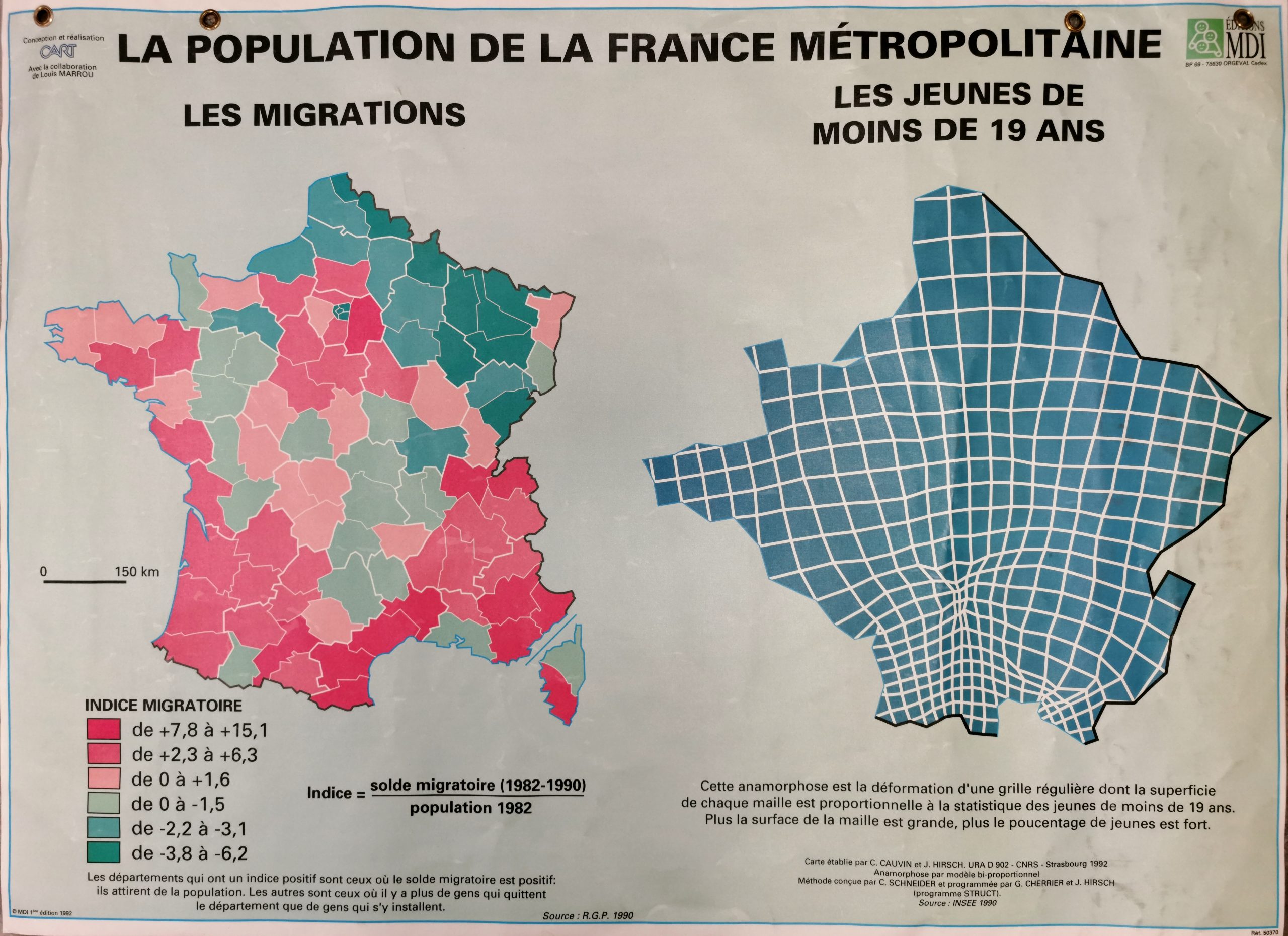 Description: Deux cartes de France : Les migrations par département (source R.G.P. 1990) et les jeunes de moins de 19 ans. Anamorphose. Carvin et Hirsch, URA 902 CNRS Strasbourg