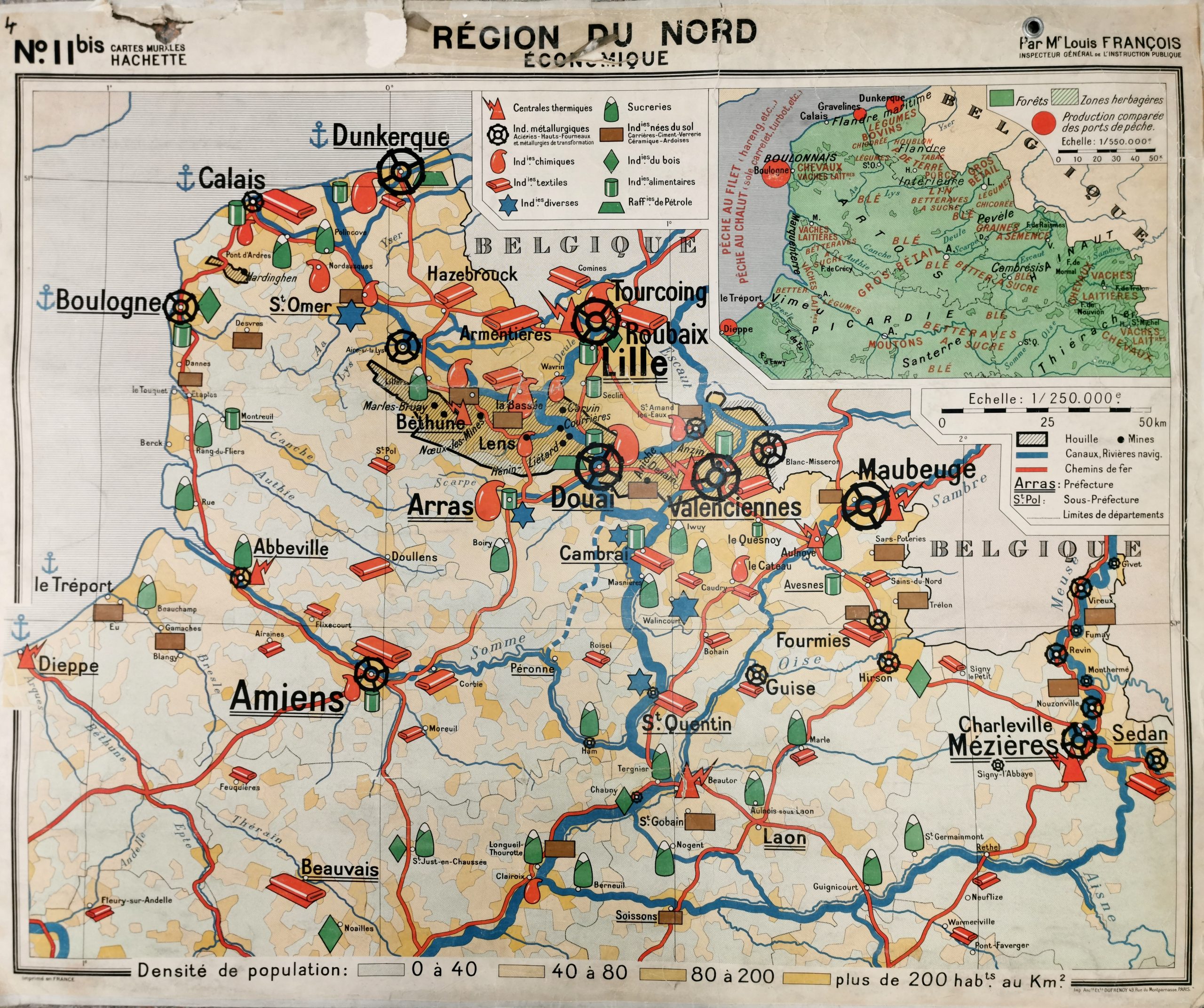Emplacement: Armoire A4(2) Numéro de carte: n°11 bis Auteur: Louis FRANCOIS inspecteur général de l'Instruction Publique Description: Centrales thermiques, industries, densité de la population. Edition : MDI / Librairie: HACHETTE / Imprimerie: Dufrenoy Echelle: 1/250 000 Taille: 120 x 99.5 Matériau: Carton avec liseret tissu. Etat de conversation: Mauvais état :haut partiellement déchiré. Encarts: En haut à droite : Carte géologique, éch. 1/750 000-Region du Nord economique