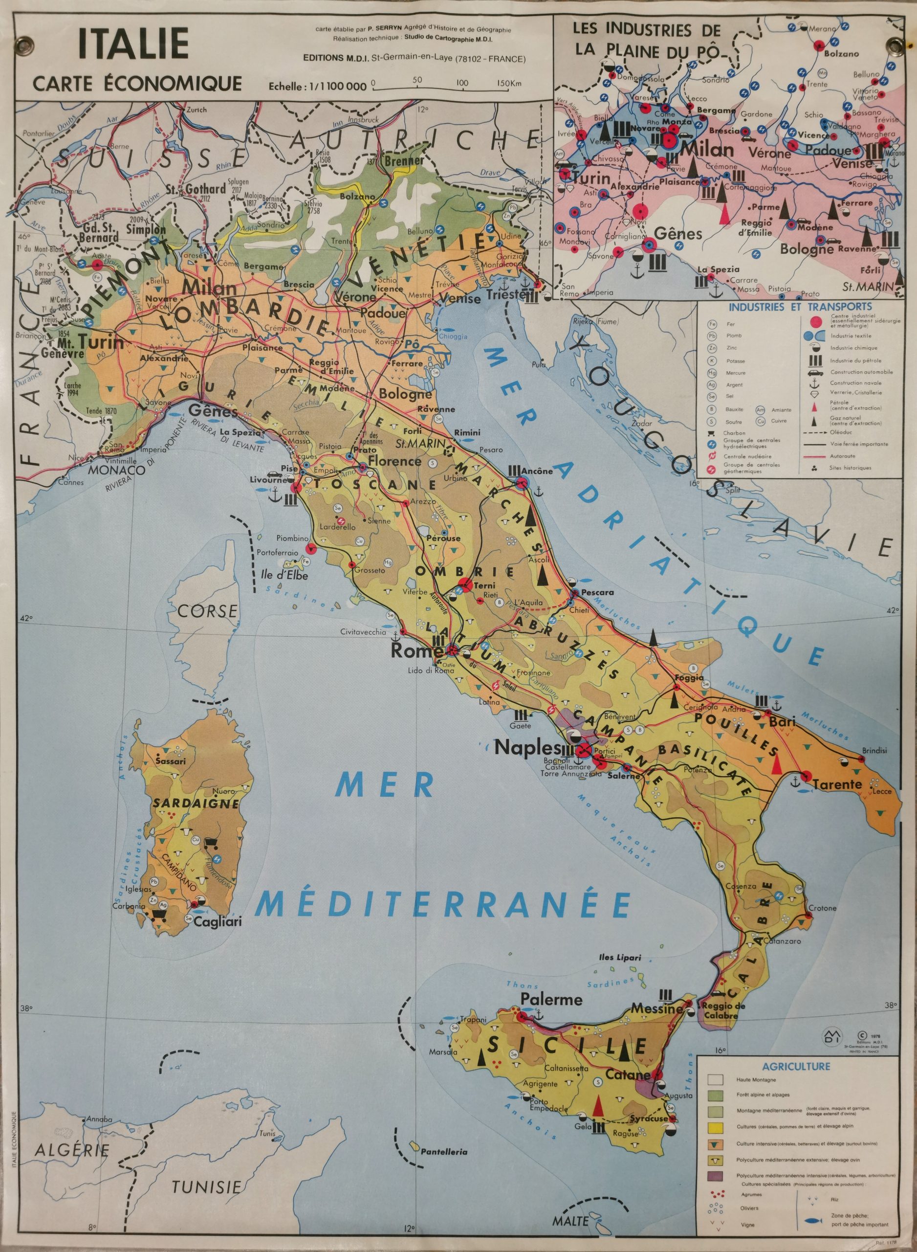 Emplacement: A9(1) Numéro de carte: ref.1178 Auteur: P. SERRYN, agrégé d'Histoire et de Géographie. Description: Agriculture, industries et transports. Edition: MDI Saint-Germain / Librairie: Réalisation technique : Studio de cartographie M.D.I. Echelle: 1/1 000 000 Date: 1978 Taille: 93 x 125,5 Matériau: Carton fin plastifié. 2 oeillets à 2 cm du bord. Etat de conversation: Bon état. Bord du haut pliures. Encart: 1 en haut à droite : Les industries de la plaine du PÔ. Pas d'éch.