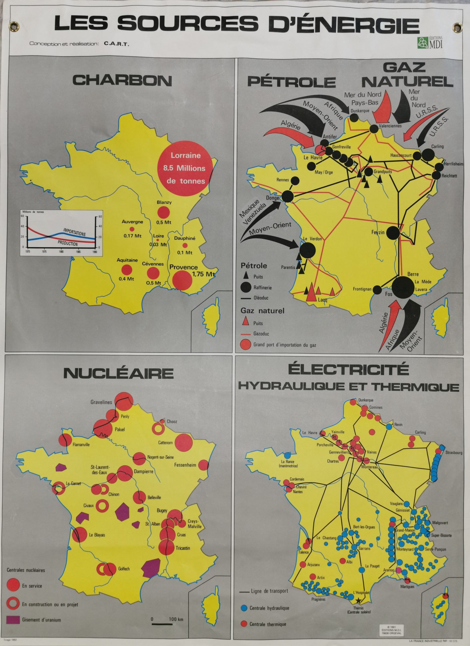 Description: Carte rectangulaire divisée en 4 carrés : 4 cartes de France avec : Charbon, Pétrole et gaz naturel, Nucléaire, Electricité.
