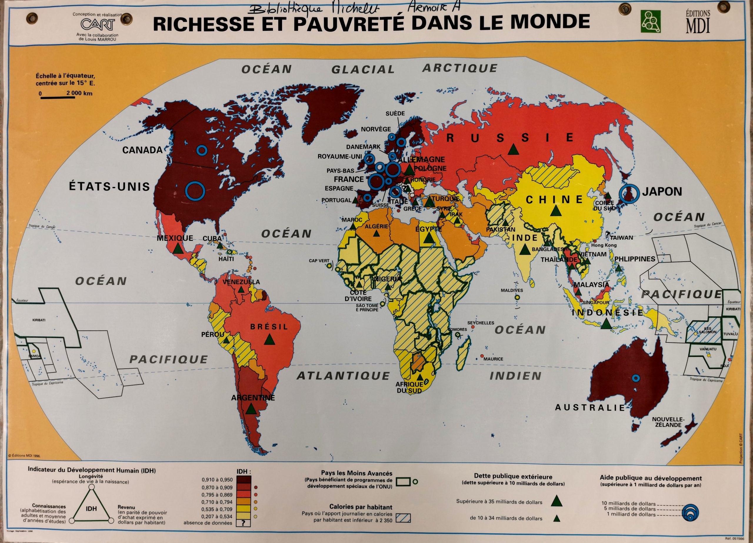 Emplacement: Armoire A1(1) Numéro de carte: ref.051566 Auteur: Conception et réalisation CART avec la collaboration de Louis MARROU (géographe) Description: Développement humain, dettes etc. Edition : MDI Date: 1996 Echelle: éch. graphique : 5,8 cm pour 2000 km. échelle à l'équateur centrée sur le 15° E Taille: 126 x 94 Matériau: Carton plastifié, 4 oeillets. Etat de conversation: Bon état. Bords plastique ourlés.